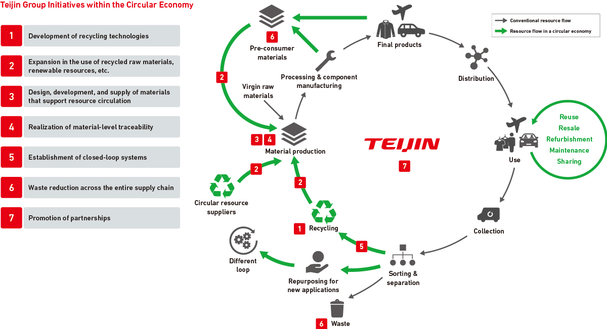 帝人集团正在积极推进实现循环经济的相关举措。要实现循环经济,关键在于尽可能长时间有效的利用资源。在保持资源价值的同时高效使用,可减少对环境的负担,并在产品和服务的整个生命周期中尽量减少废弃物和有害物质的排放。帝人集团通过与多方合作伙伴的协作,在价值链的各个阶段推进如①~⑦所示的具体举措。