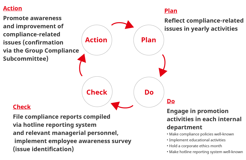 基于“合规推进是构建健全企业文化的活动”这一理念,我们不仅致力于普及与业务相关的法律法规和公司内部规章制度,还积极推动企业伦理的全面认知与贯彻,具体包括以下举措:
