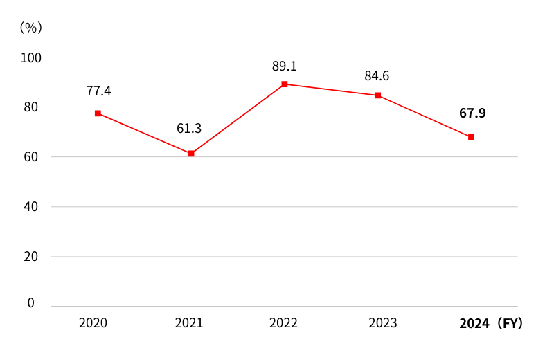 在我们集团内部,正在努力营造一个无论性别如何,任何人都可以使用育儿支持制度的企业文化。在帝人株式会社,2022年度我们对制度进行了修订,使员工在取得育儿休假时可以使用个人积累的年假,从而无论男女,最多可获得55天的带薪休假。此外,我们还通过公司高层发布鼓励育儿休假的信息,以及在公司内部刊物和内网等渠道分享男性员工育儿休假的经验故事,积极推动制度的普及。2024年度男性员工的育儿休假取得率达到了67.9%。